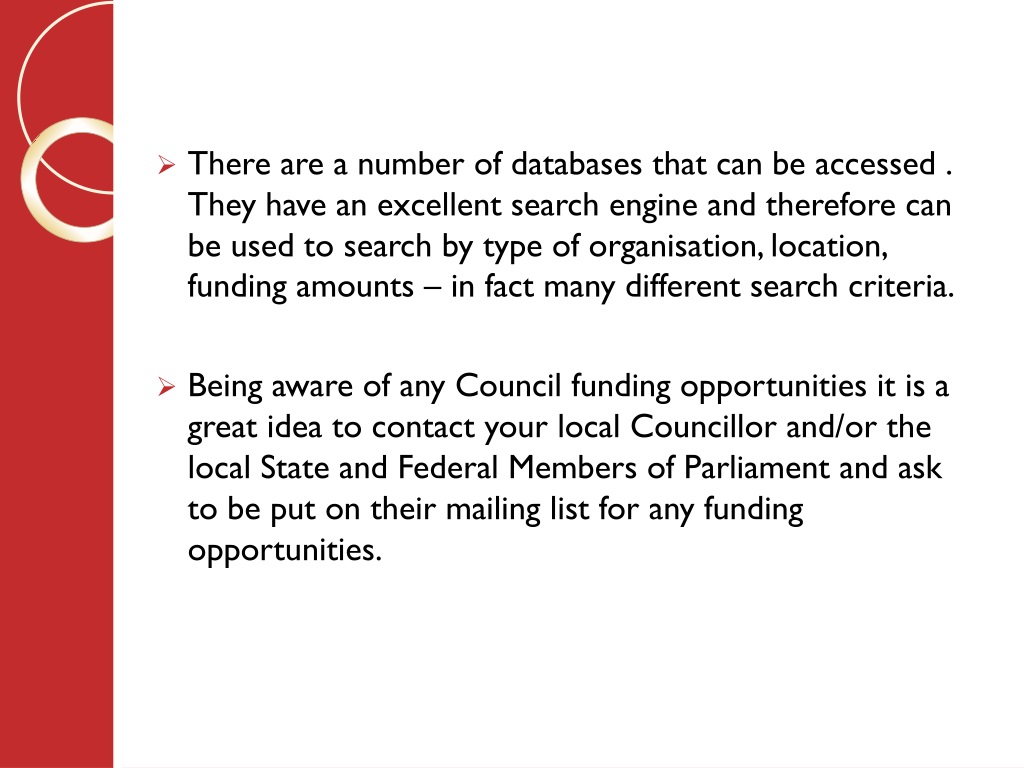 There are a number of databases that can be accessed . They have an excellent search engine and therefore can be used to search by type of organisation, location, funding amounts – in fact many different search criteria. • Being aware of any Council funding opportunities it is a great idea to contact your local Councillor and/or the local State and Federal Members of Parliament and ask to be put on their mailing list for any funding opportunities.