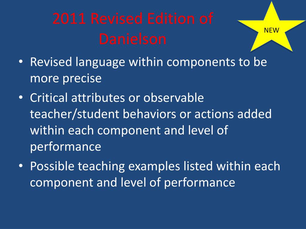 NEW 2011 Revised Edition of Danielson • Revised language within components to be more precise • Critical attributes or observable teacher/student behaviors or actions added within each component and level of performance • Possible teaching examples listed within each component and level of performance