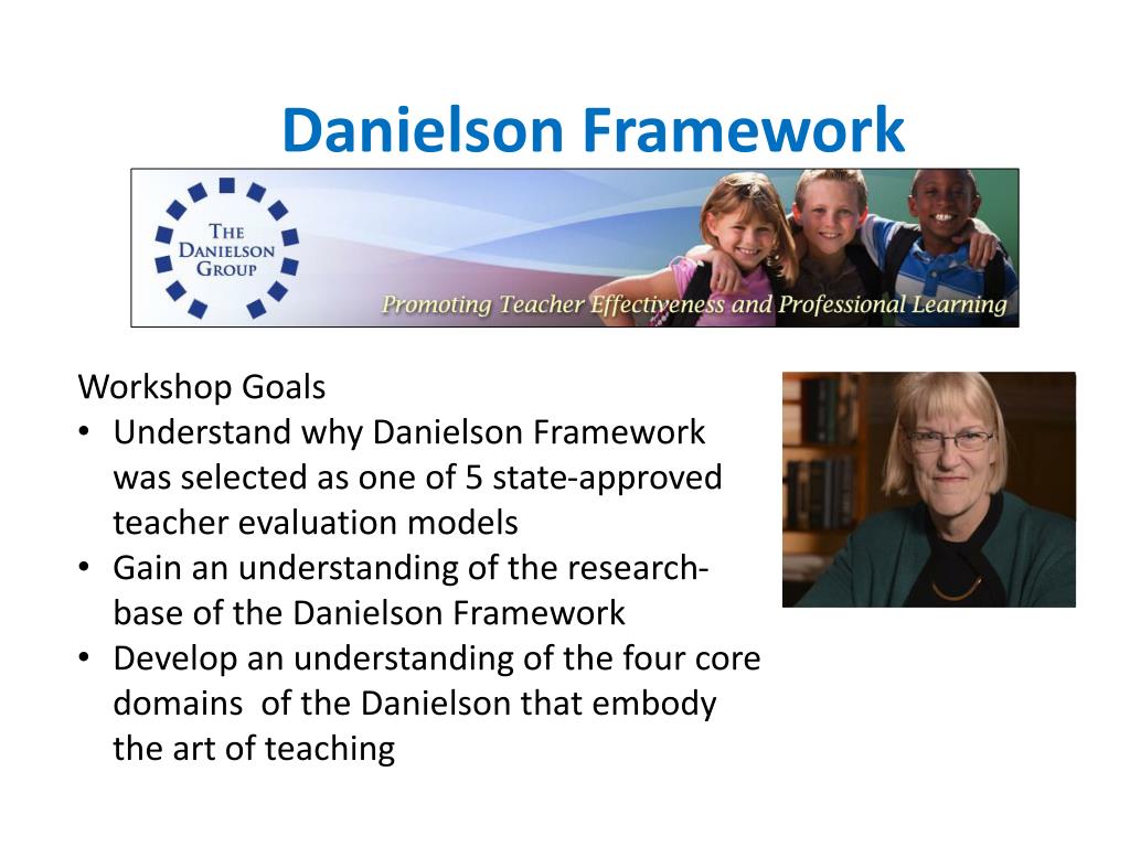 Danielson Framework • Workshop Goals • Understand why Danielson Framework was selected as one of 5 state-approved teacher evaluation models • Gain an understanding of the research-base of the Danielson Framework • Develop an understanding of the four core domains of the Danielson that embody the art of teaching
