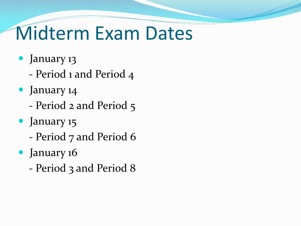 Midterm Exam Dates • January 13 - Period 1 and Period 4 • January 14 - Period 2 and Period 5 • January 15 - Period 7 and Period 6 • January 16 - Period 3 and Period 8