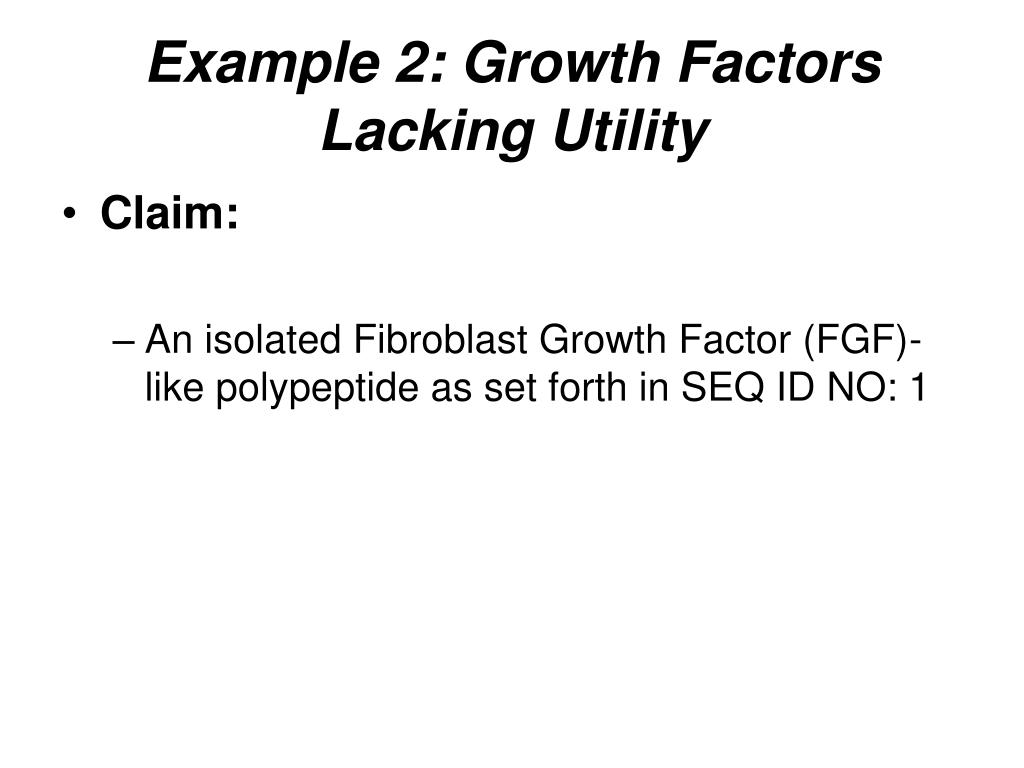 Example 2: Growth Factors Lacking Utility • Claim: • An isolated Fibroblast Growth Factor (FGF)-like polypeptide as set forth in SEQ ID NO: 1