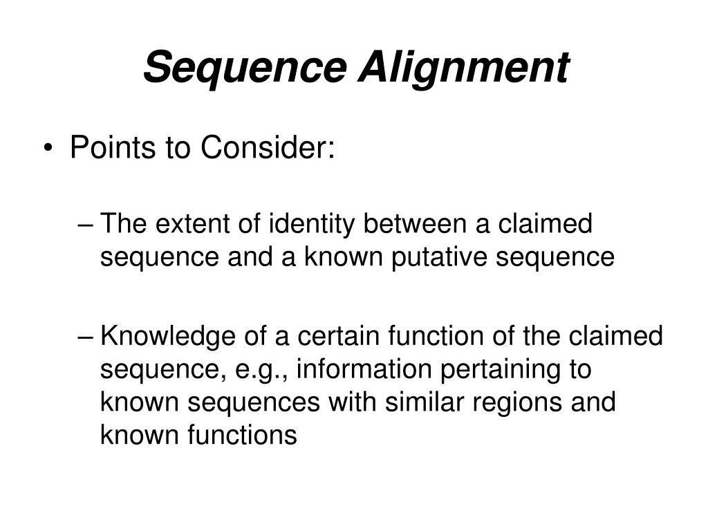 Sequence Alignment • Points to Consider: • The extent of identity between a claimed sequence and a known putative sequence • Knowledge of a certain function of the claimed sequence, e.g., information pertaining to known sequences with similar regions and known functions