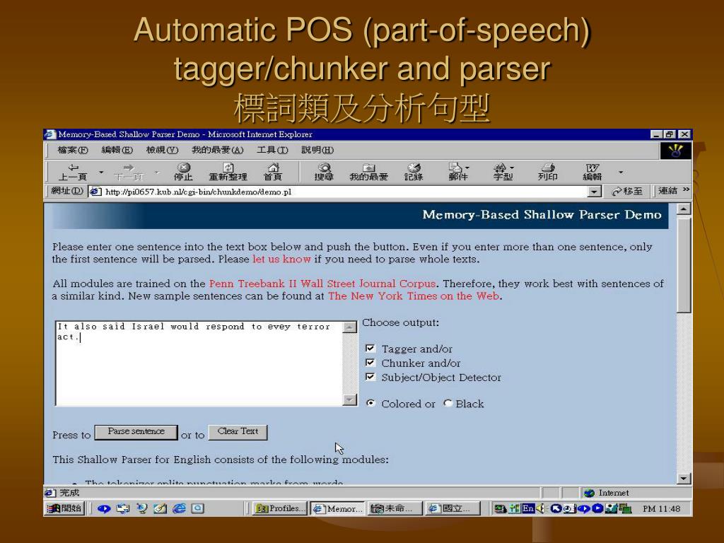 Automatic POS (part-of-speech) tagger/chunker and parser 標詞類及分析句型
