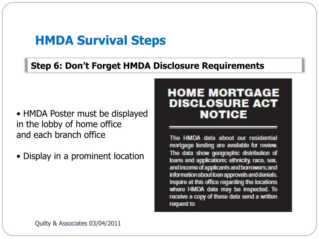HMDA Survival Steps Step 6: Don’t Forget HMDA Disclosure Requirements • HMDA Poster must be displayed • in the lobby of home office • and each branch office • Display in a prominent location Quilty & Associates 03/04/2011
