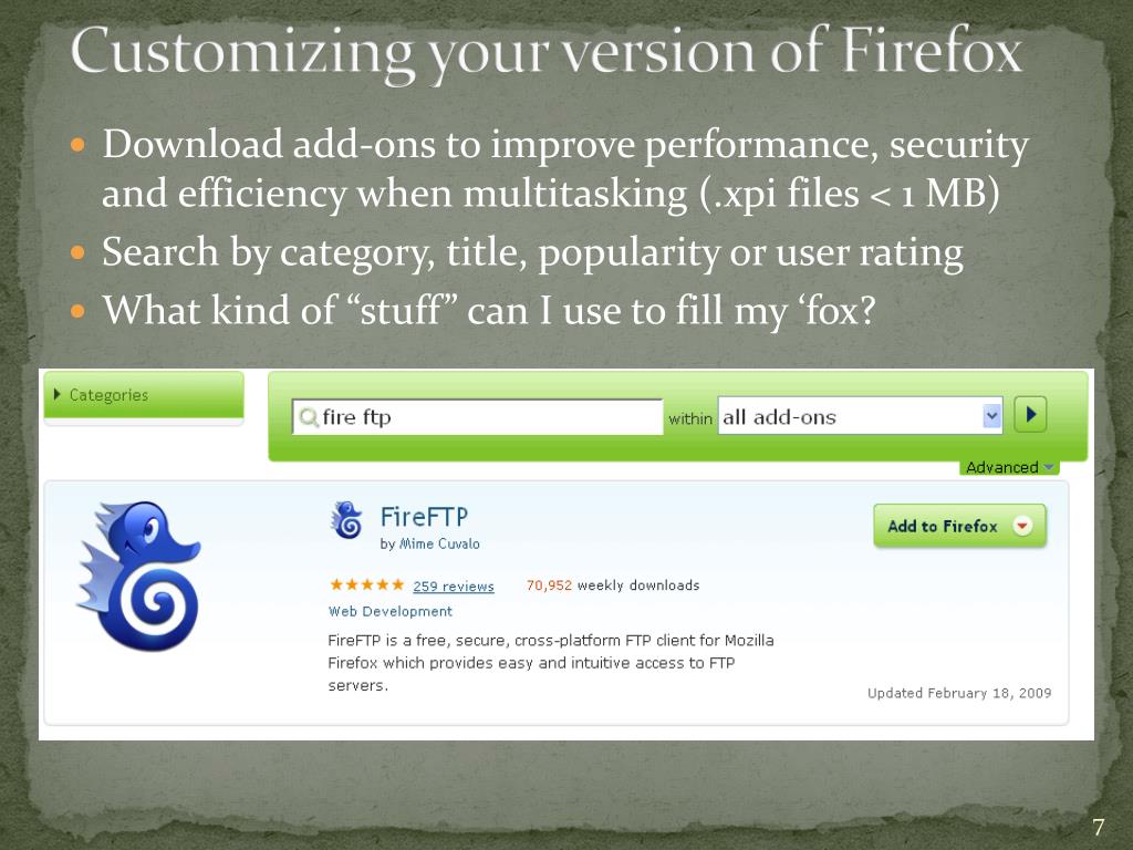 Customizing your version of Firefox • Download add-ons to improve performance, security and efficiency when multitasking (.xpi files < 1 MB) • Search by category, title, popularity or user rating • What kind of “stuff” can I use to fill my ‘fox?