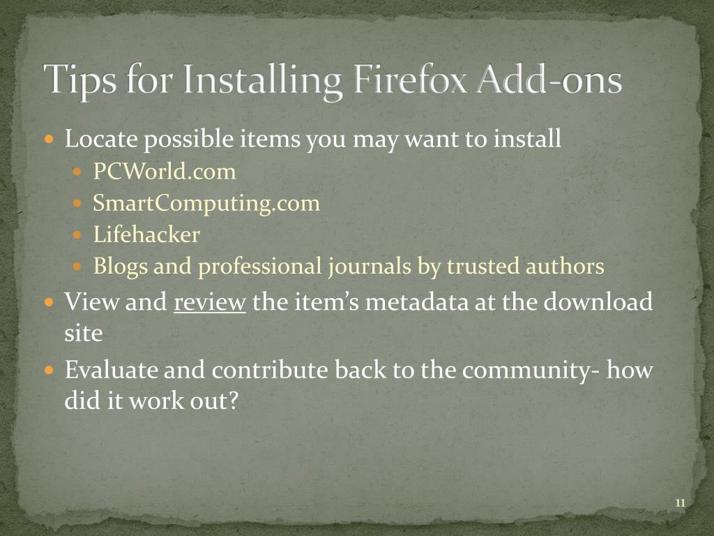 Tips for Installing Firefox Add-ons • Locate possible items you may want to install • PCWorld.com • SmartComputing.com • Lifehacker • Blogs and professional journals by trusted authors • View and review the item’s metadata at the download site • Evaluate and contribute back to the community- how did it work out?