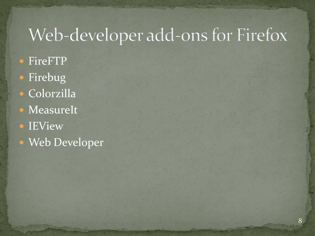 Web-developer add-ons for Firefox • FireFTP • Firebug • Colorzilla • MeasureIt • IEView • Web Developer