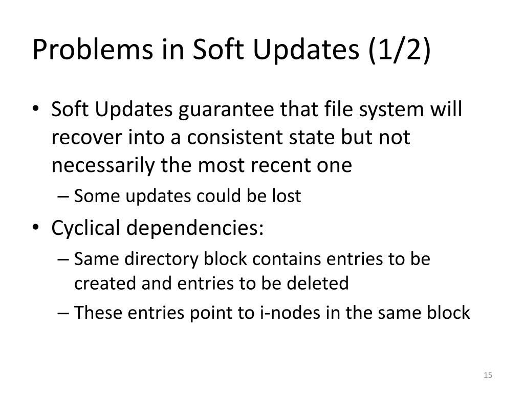 Problems in Soft Updates (1/2) • Soft Updates guarantee that file system will recover into a consistent state but not necessarily the most recent one • Some updates could be lost • Cyclical dependencies: • Same directory block contains entries to be created and entries to be deleted • These entries point to i-nodes in the same block