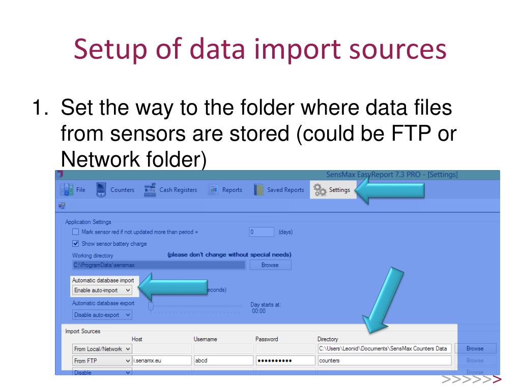 Setup of data import sources • Set the way to the folder where data files from sensors are stored (could be FTP or Network folder) >>>>>>