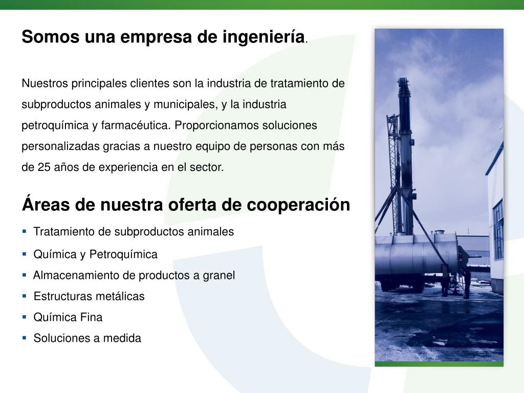 Somos una empresa de ingeniería. Nuestros principales clientes son la industria de tratamiento de subproductos animales y municipales, y la industria petroquímica y farmacéutica. Proporcionamos soluciones personalizadas gracias a nuestro equipo de personas con más de 25 años de experiencia en el sector. • Áreas de nuestra oferta de cooperación • Tratamiento de subproductos animales • Química y Petroquímica • Almacenamiento de productos a granel • Estructuras metálicas • Química Fina • Soluciones a medida