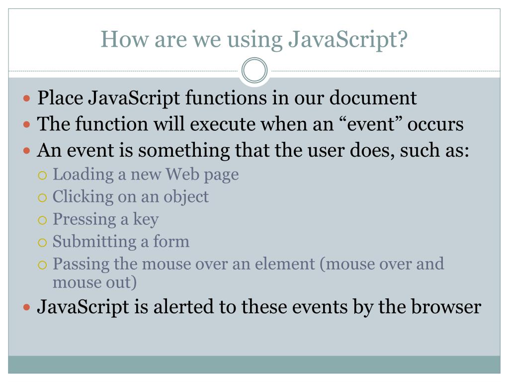 How are we using JavaScript? • Place JavaScript functions in our document • The function will execute when an “event” occurs • An event is something that the user does, such as: • Loading a new Web page • Clicking on an object • Pressing a key • Submitting a form • Passing the mouse over an element (mouse over and mouse out) • JavaScript is alerted to these events by the browser