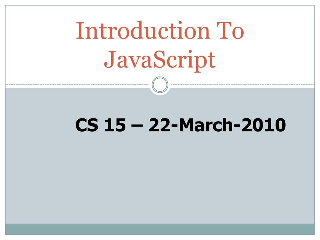 Introduction To JavaScript. CS 15 – 22-March-2010. What is JavaScript?. A programming language It is interpreted by Web browsers and servers Just like XHTML and CSS XHTML – identifies the content (elements) of a web document