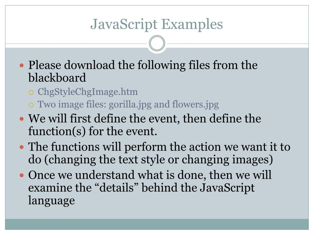 JavaScript Examples • Please download the following files from the blackboard • ChgStyleChgImage.htm • Two image files: gorilla.jpg and flowers.jpg • We will first define the event, then define the function(s) for the event. • The functions will perform the action we want it to do (changing the text style or changing images) • Once we understand what is done, then we will examine the “details” behind the JavaScript language
