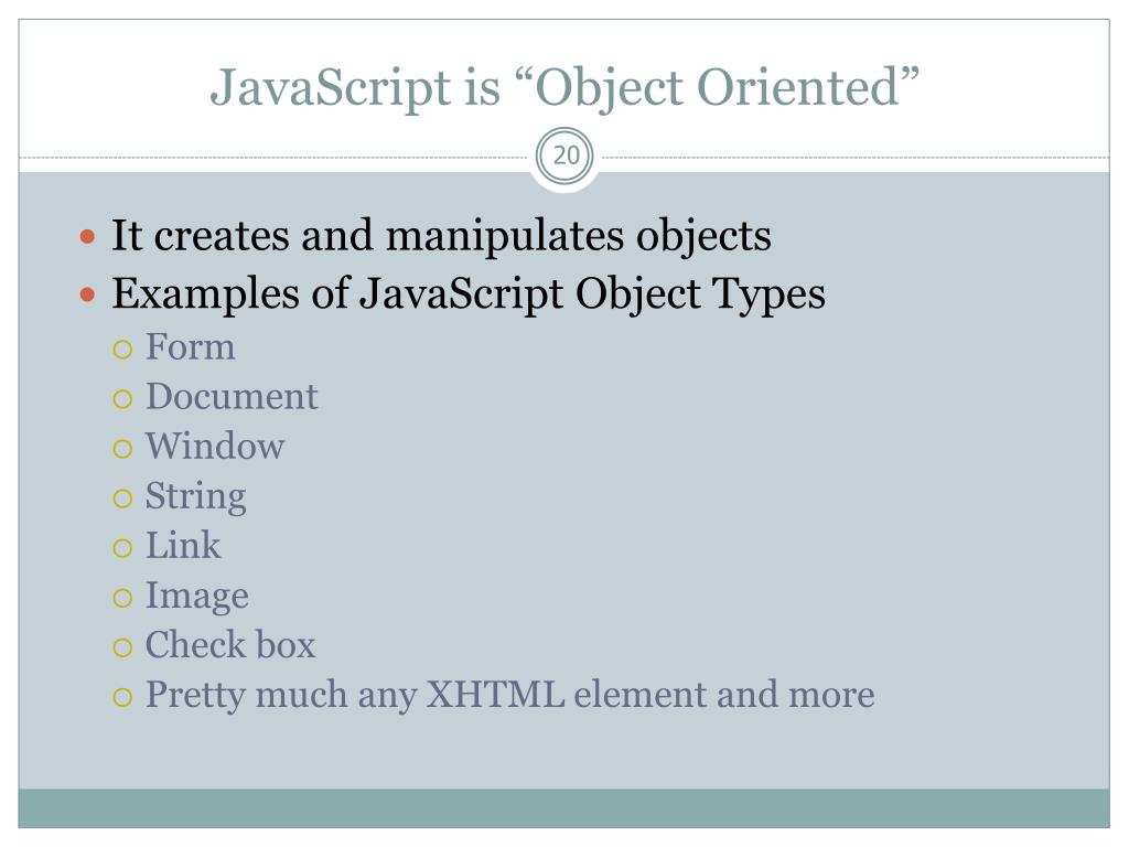 JavaScript is “Object Oriented” • It creates and manipulates objects • Examples of JavaScript Object Types • Form • Document • Window • String • Link • Image • Check box • Pretty much any XHTML element and more