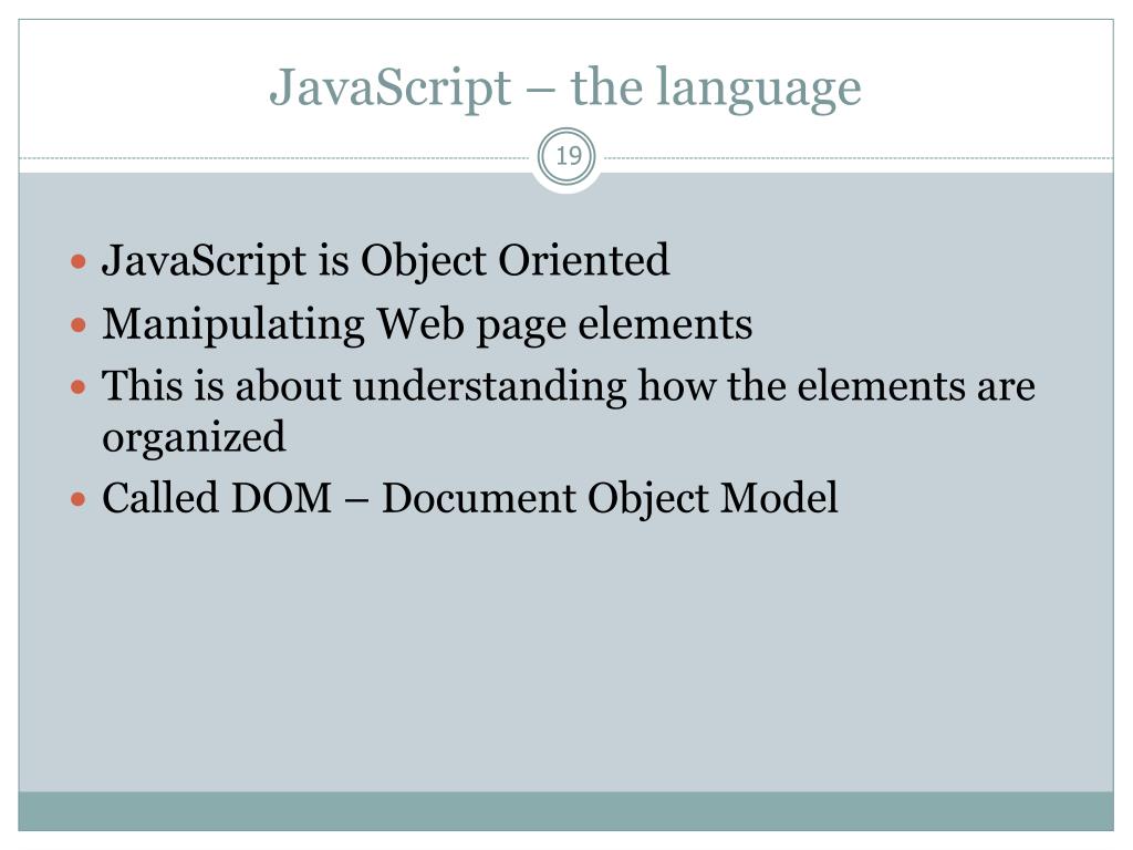 JavaScript – the language JavaScript is Object Oriented Manipulating Web page elements This is about understanding how the elements are organized Called DOM – Document Object Model