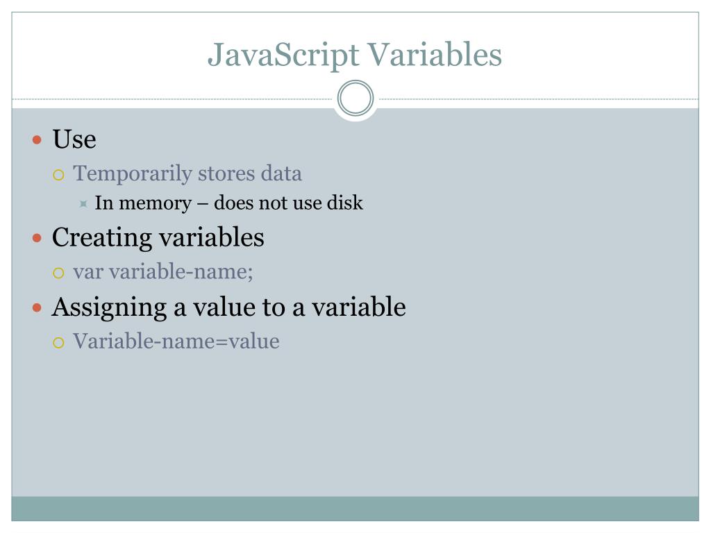 JavaScript Variables • Use • Temporarily stores data • In memory – does not use disk • Creating variables • var variable-name; • Assigning a value to a variable • Variable-name=value