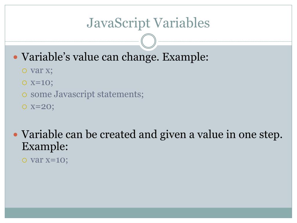 JavaScript Variables • Variable’s value can change. Example: • var x; • x=10; • some Javascript statements; • x=20; • Variable can be created and given a value in one step. Example: • var x=10;