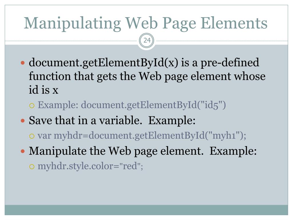 Manipulating Web Page Elements • document.getElementById(x) is a pre-defined function that gets the Web page element whose id is x • Example: document.getElementById("id5") • Save that in a variable. Example: • varmyhdr=document.getElementById("myh1"); • Manipulate the Web page element. Example: • myhdr.style.color="red";