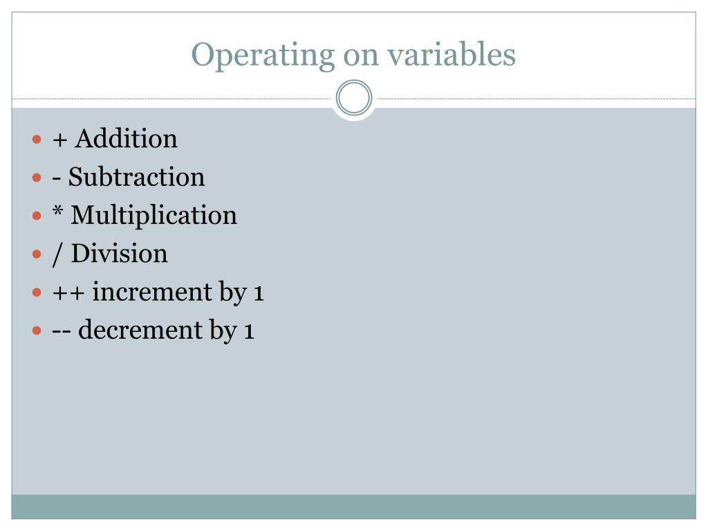 Operating on variables + Addition - Subtraction * Multiplication / Division ++ increment by 1 -- decrement by 1