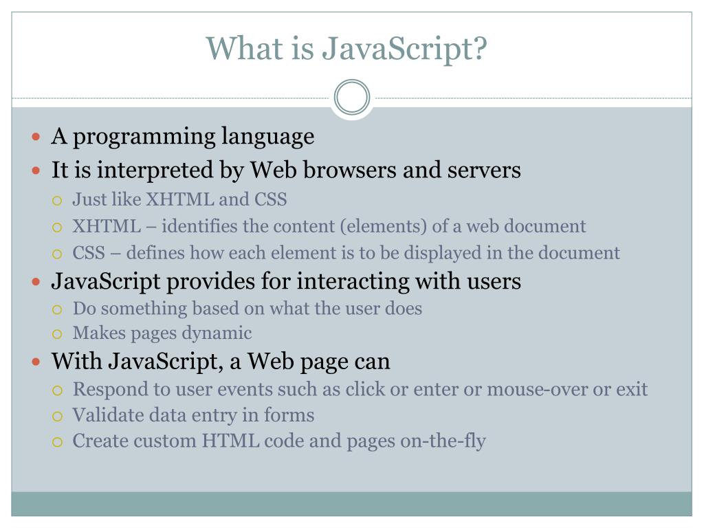 What is JavaScript? • A programming language • It is interpreted by Web browsers and servers • Just like XHTML and CSS • XHTML – identifies the content (elements) of a web document • CSS – defines how each element is to be displayed in the document • JavaScript provides for interacting with users • Do something based on what the user does • Makes pages dynamic • With JavaScript, a Web page can • Respond to user events such as click or enter or mouse-over or exit • Validate data entry in forms • Create custom HTML code and pages on-the-fly
