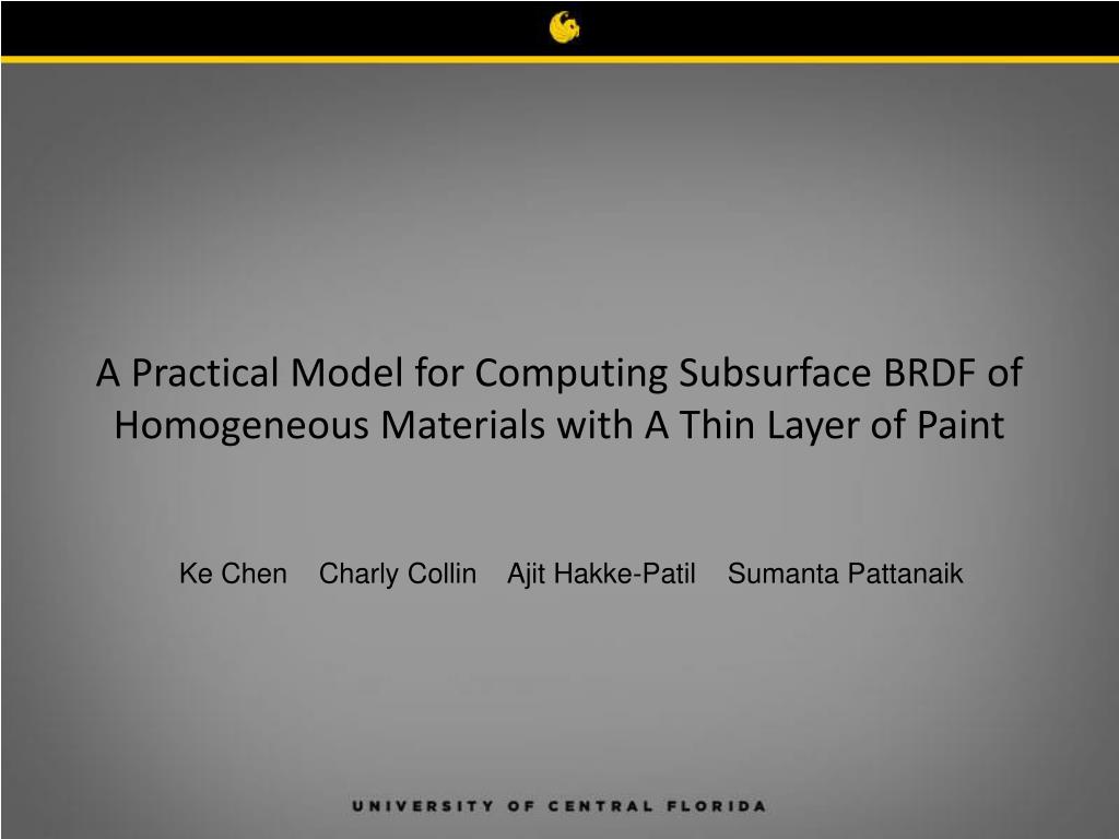 A Practical Model for Computing Subsurface BRDF of Homogeneous Materials with A Thin Layer of Paint. Ke Chen Charly Collin Ajit Hakke-Patil Sumanta Pattanaik. Overview. Introduction and motivation. BRDF = surface BRDF + subsurface BRDF [ Hanrahan and Krueger 1993].