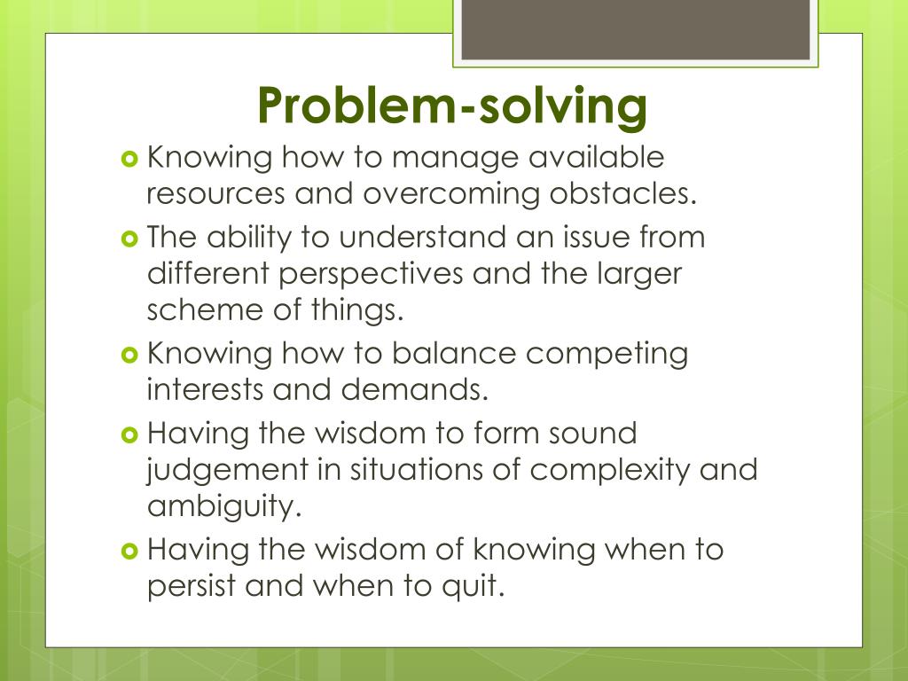 Problem-solving • Knowing how to manage available resources and overcoming obstacles. • The ability to understand an issue from different perspectives and the larger scheme of things. • Knowing how to balance competing interests and demands. • Having the wisdom to form sound judgement in situations of complexity and ambiguity. • Having the wisdom of knowing when to persist and when to quit.