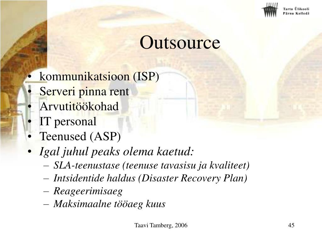 Outsource • kommunikatsioon (ISP) • Serveri pinna rent • Arvutitöökohad • IT personal • Teenused (ASP) • Igal juhul peaks olema kaetud: • SLA-teenustase (teenuse tavasisu ja kvaliteet) • Intsidentide haldus (Disaster Recovery Plan) • Reageerimisaeg • Maksimaalne tööaeg kuus Taavi Tamberg, 2006