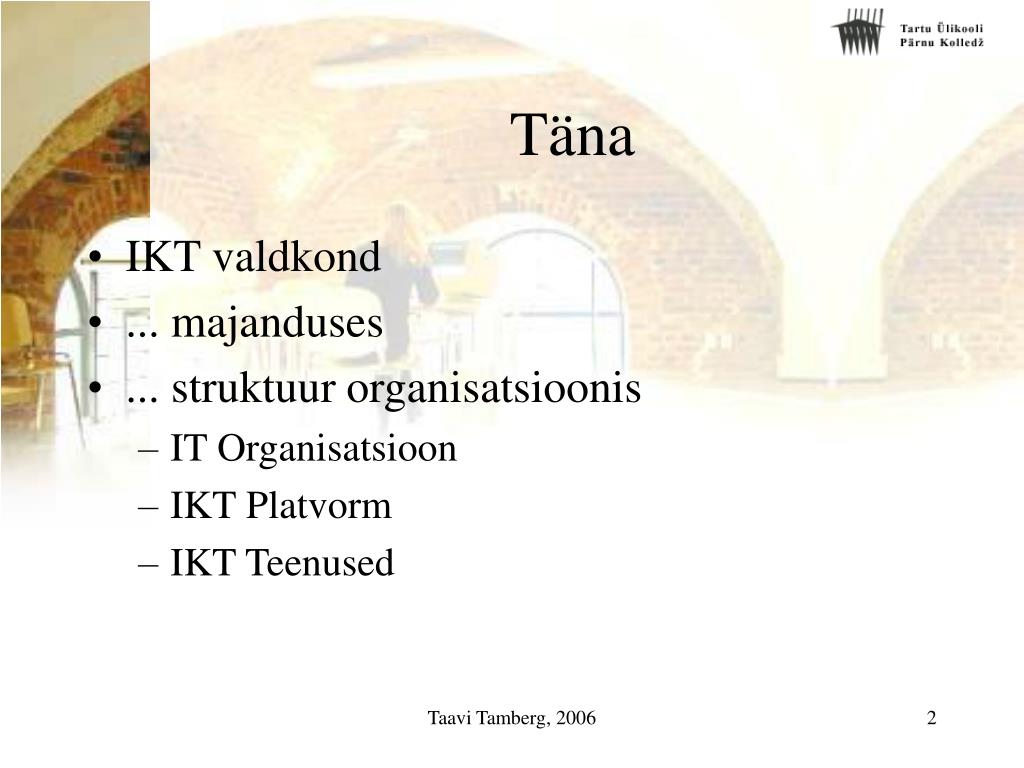 Täna • IKT valdkond • ... majanduses • ... struktuur organisatsioonis • IT Organisatsioon • IKT Platvorm • IKT Teenused Taavi Tamberg, 2006