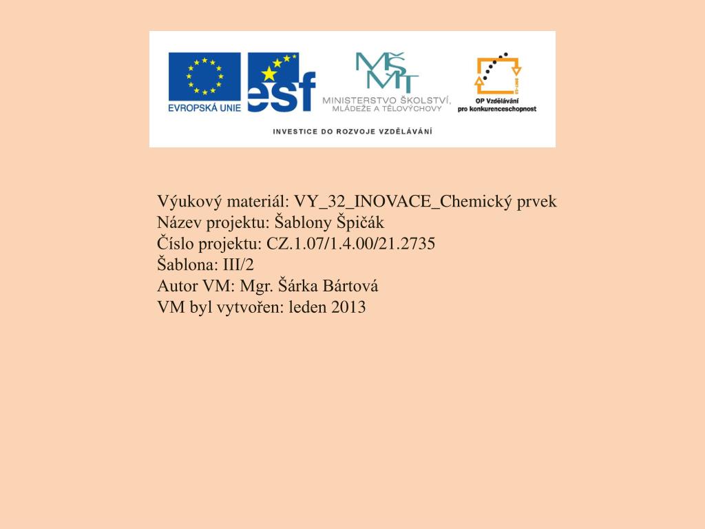 Výukový materiál: VY_32_INOVACE_Chemický prvek Název projektu: Šablony Špičák Číslo projektu: CZ.1.07/1.4.00/21.2735 Šablona: III/2 Autor VM: Mgr. Šárka Bártová VM byl vytvořen: leden 2013
