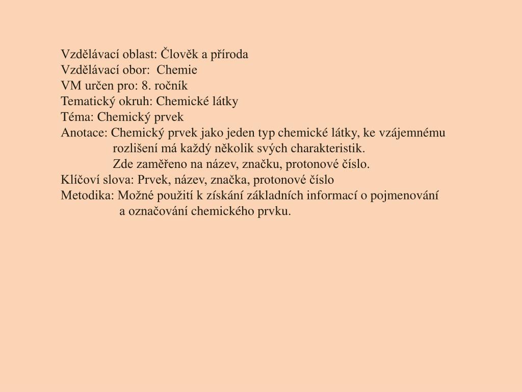 Vzdělávací oblast: Člověk a příroda Vzdělávací obor: Chemie VM určen pro: 8. ročník Tematický okruh: Chemické látky Téma: Chemický prvek Anotace: Chemický prvek jako jeden typ chemické látky, ke vzájemnému rozlišení má každý několik svých charakteristik. Zde zaměřeno na název, značku, protonové číslo. Klíčoví slova: Prvek, název, značka, protonové číslo Metodika: Možné použití k získání základních informací o pojmenování a označování chemického prvku.