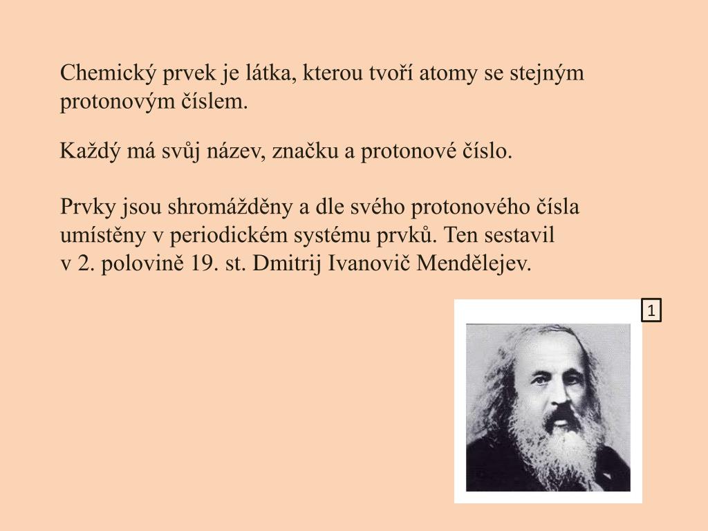 Chemický prvek je látka, kterou tvoří atomy se stejným protonovým číslem. Každý má svůj název, značku a protonové číslo. Prvky jsou shromážděny a dle svého protonového čísla umístěny v periodickém systému prvků. Ten sestavil v 2. polovině 19. st. Dmitrij Ivanovič Mendělejev. 1