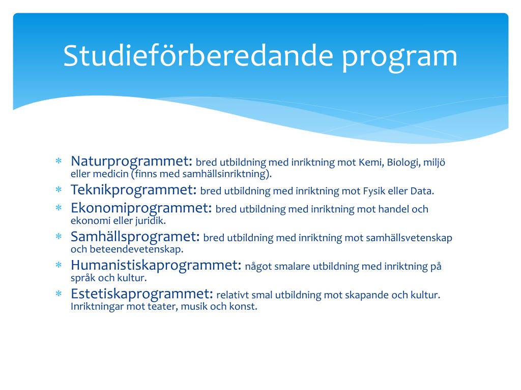 Studieförberedande program Naturprogrammet: bred utbildning med inriktning mot Kemi, Biologi, miljö eller medicin (finns med samhällsinriktning). Teknikprogrammet: bred utbildning med inriktning mot Fysik eller Data. Ekonomiprogrammet: bred utbildning med inriktning mot handel och ekonomi eller juridik. Samhällsprogramet: bred utbildning med inriktning mot samhällsvetenskap och beteendevetenskap. Humanistiskaprogrammet: något smalare utbildning med inriktning på språk och kultur. Estetiskaprogrammet: relativt smal utbildning mot skapande och kultur. Inriktningar mot teater, musik och konst.