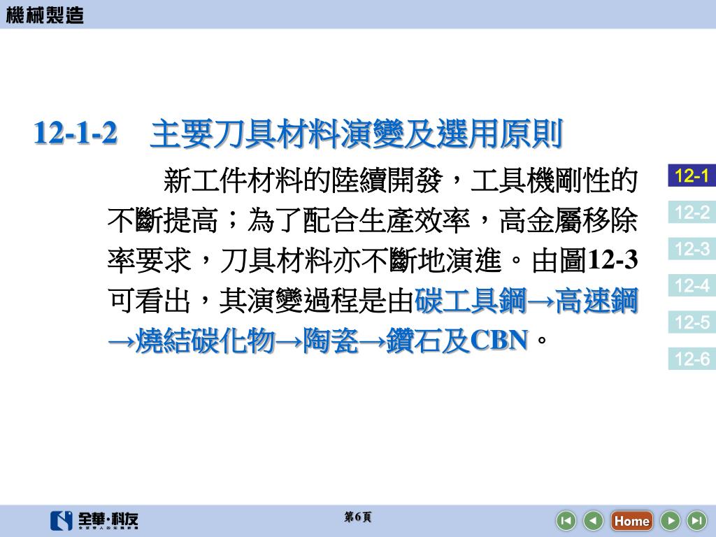 12-1-2 主要刀具材料演變及選用原則 新工件材料的陸續開發,工具機剛性的不斷提高;為了配合生產效率,高金屬移除率要求,刀具材料亦不斷地演進。由圖12-3可看出,其演變過程是由碳工具鋼→高速鋼→燒結碳化物→陶瓷→鑽石及CBN。
