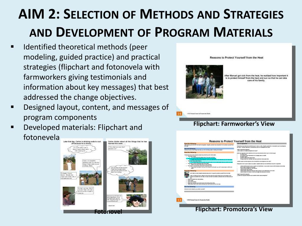 AIM 2: Selection of Methods and Strategies and Development of Program Materials • Identified theoretical methods (peer modeling, guided practice) and practical strategies (flipchart and fotonovela with farmworkers giving testimonials and information about key messages) that best addressed the change objectives. • Designed layout, content, and messages of program components • Developed materials: Flipchart and fotonevela Flipchart: Farmworker’s View Flipchart: Promotora’s View Fotonovel