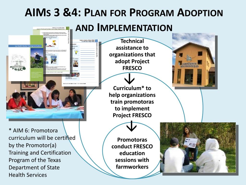 AIMs 3 &4: Plan for Program Adoption and Implementation * AIM 6: Promotora curriculum will be certified by the Promotor(a) Training and Certification Program of the Texas Department of State Health Services