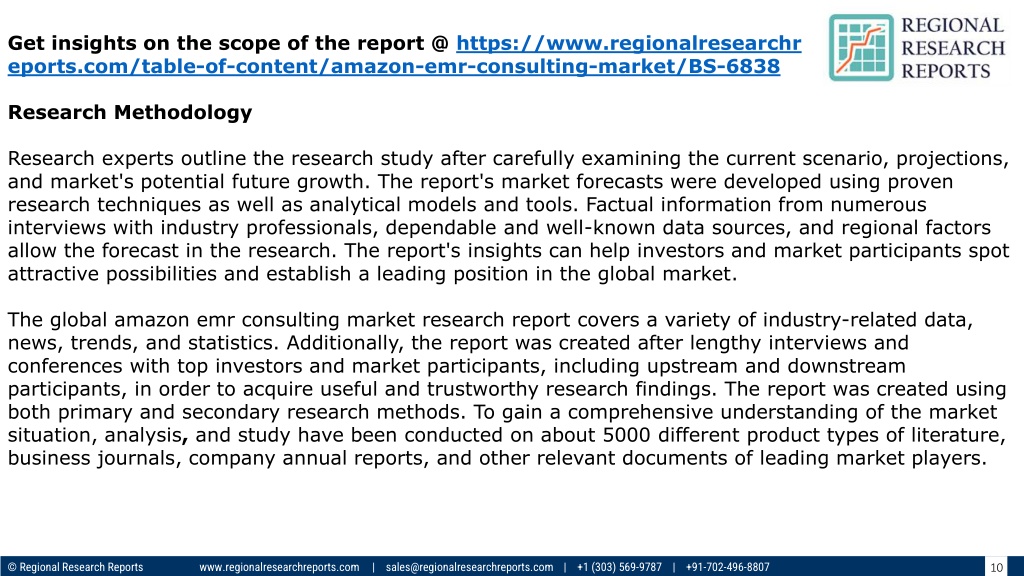 Get insights on the scope of the report @ https://www.regionalresearchr eports.com/table-of-content/amazon-emr-consulting-market/BS-6838 Research Methodology Research experts outline the research study after carefully examining the current scenario, projections, and market's potential future growth. The report's market forecasts were developed using proven research techniques as well as analytical models and tools. Factual information from numerous interviews with industry professionals, dependable and well-known data sources, and regional factors allow the forecast in the research. The report's insights can help investors and market participants spot attractive possibilities and establish a leading position in the global market. The global amazon emr consulting market research report covers a variety of industry-related data, news, trends, and statistics. Additionally, the report was created after lengthy interviews and conferences with top investors and market participants, including upstream and downstream participants, in order to acquire useful and trustworthy research findings. The report was created using both primary and secondary research methods. To gain a comprehensive understanding of the market situation, analysis, and study have been conducted on about 5000 different product types of literature, business journals, company annual reports, and other relevant documents of leading market players. © Regional Research Reports www.regionalresearchreports.com | sales@regionalresearchreports.com | +1 (303) 569-9787 | +91-702-496-8807 10