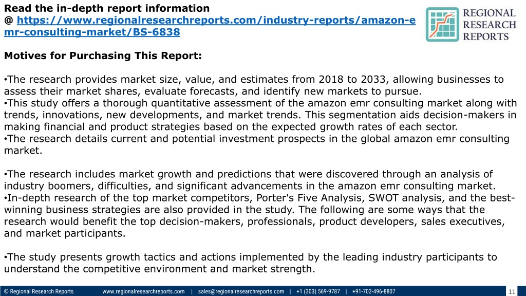 Read the in-depth report information @ https://www.regionalresearchreports.com/industry-reports/amazon-e mr-consulting-market/BS-6838 Motives for Purchasing This Report: •The research provides market size, value, and estimates from 2018 to 2033, allowing businesses to assess their market shares, evaluate forecasts, and identify new markets to pursue. •This study offers a thorough quantitative assessment of the amazon emr consulting market along with trends, innovations, new developments, and market trends. This segmentation aids decision-makers in making financial and product strategies based on the expected growth rates of each sector. •The research details current and potential investment prospects in the global amazon emr consulting market. •The research includes market growth and predictions that were discovered through an analysis of industry boomers, difficulties, and significant advancements in the amazon emr consulting market. •In-depth research of the top market competitors, Porter's Five Analysis, SWOT analysis, and the best- winning business strategies are also provided in the study. The following are some ways that the research would benefit the top decision-makers, professionals, product developers, sales executives, and market participants. •The study presents growth tactics and actions implemented by the leading industry participants to understand the competitive environment and market strength. © Regional Research Reports www.regionalresearchreports.com | sales@regionalresearchreports.com | +1 (303) 569-9787 | +91-702-496-8807 11