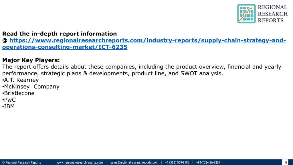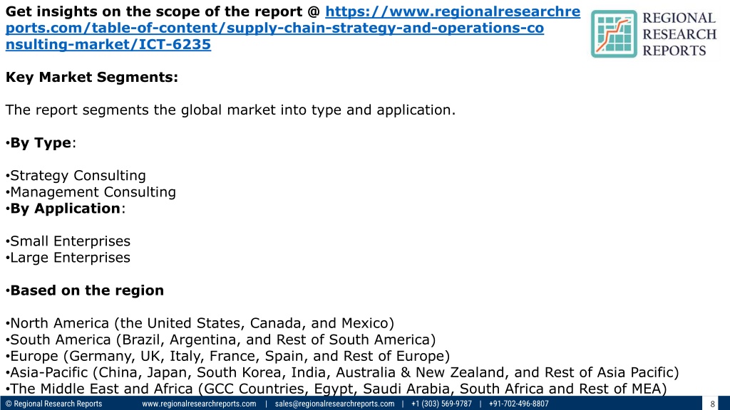 Get insights on the scope of the report @ https://www.regionalresearchre ports.com/table-of-content/supply-chain-strategy-and-operations-co nsulting-market/ICT-6235 Key Market Segments: The report segments the global market into type and application. •By Type: •Strategy Consulting •Management Consulting •By Application: •Small Enterprises •Large Enterprises •Based on the region •North America (the United States, Canada, and Mexico) •South America (Brazil, Argentina, and Rest of South America) •Europe (Germany, UK, Italy, France, Spain, and Rest of Europe) •Asia-Pacific (China, Japan, South Korea, India, Australia & New Zealand, and Rest of Asia Pacific) •The Middle East and Africa (GCC Countries, Egypt, Saudi Arabia, South Africa and Rest of MEA) © Regional Research Reports www.regionalresearchreports.com | sales@regionalresearchreports.com | +1 (303) 569-9787 | +91-702-496-8807 8