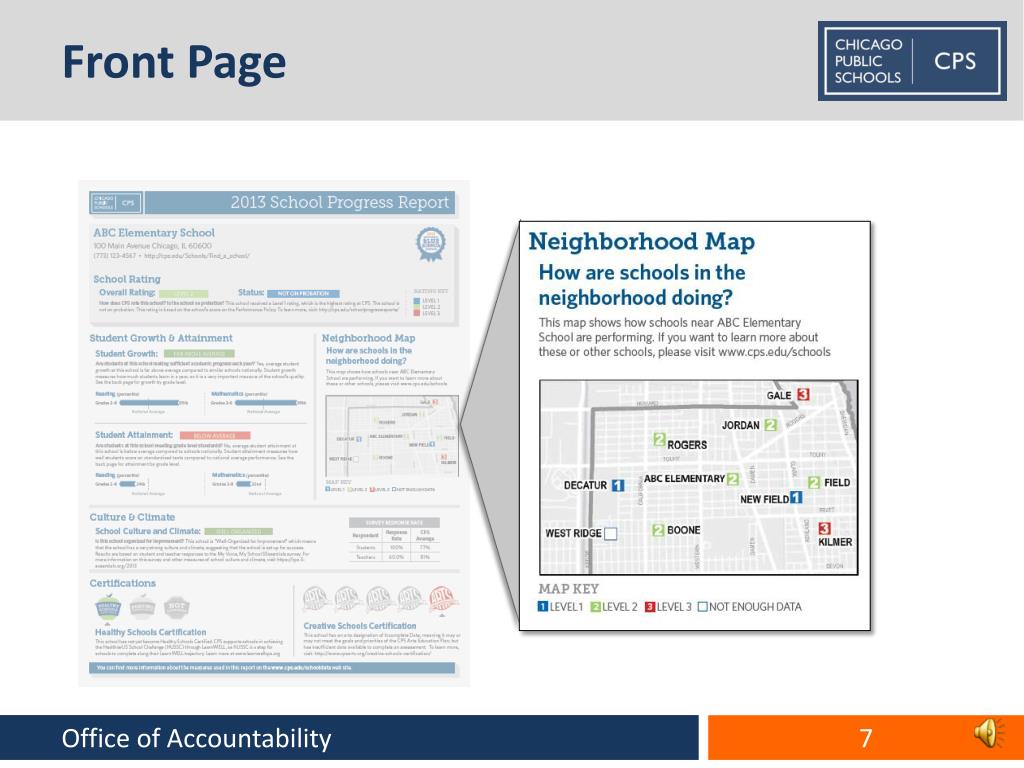 Purpose of School Progress Reports • To provide information for families and community members about the performance of their child’s school and other schools in CPS during the 2012-2013 school year. • To notify parents of the school’s Performance Policy results and probation status for 2013-2014. • To provide a holistic view of the school, including non-assessment measures such as Culture and Climate, health, the arts, college enrollment and persistence, and more. • To encourage dialog between parents, faculty, and school leadership about how the school is performing, it’s plan for improvement, and how parents can get involved. • To begin informing parents about the measures that will be used in the future in CPS, especially through the School Quality Rating Policy. Office of Accountability
