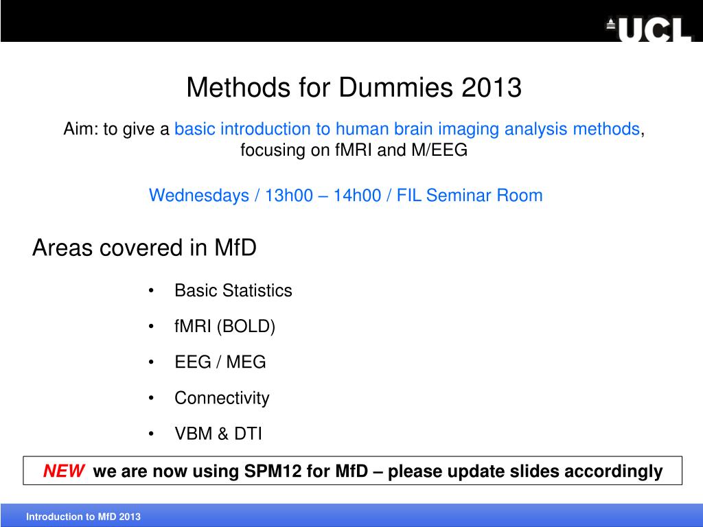 Methods for Dummies 2013 Aim: to give a basic introduction to human brain imaging analysis methods, focusing on fMRI and M/EEG Wednesdays / 13h00 – 14h00 / FIL Seminar Room NEW we are now using SPM12 for MfD – please update slides accordingly Introduction to MfD2013