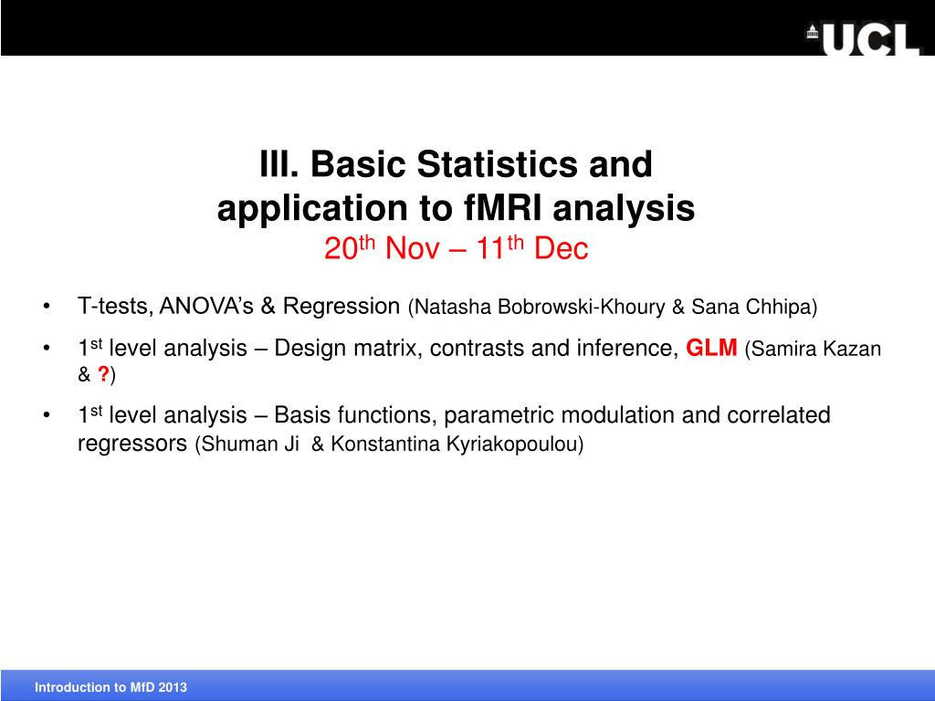 III. Basic Statistics and application to fMRIanalysis20thNov – 11thDec • T-tests, ANOVA’s & Regression (Natasha Bobrowski-Khoury & Sana Chhipa) • 1stlevel analysis – Design matrix, contrasts and inference, GLM(Samira Kazan & ?) • 1st level analysis – Basis functions, parametric modulation and correlated regressors(Shuman Ji&KonstantinaKyriakopoulou) Introduction to MfD2013