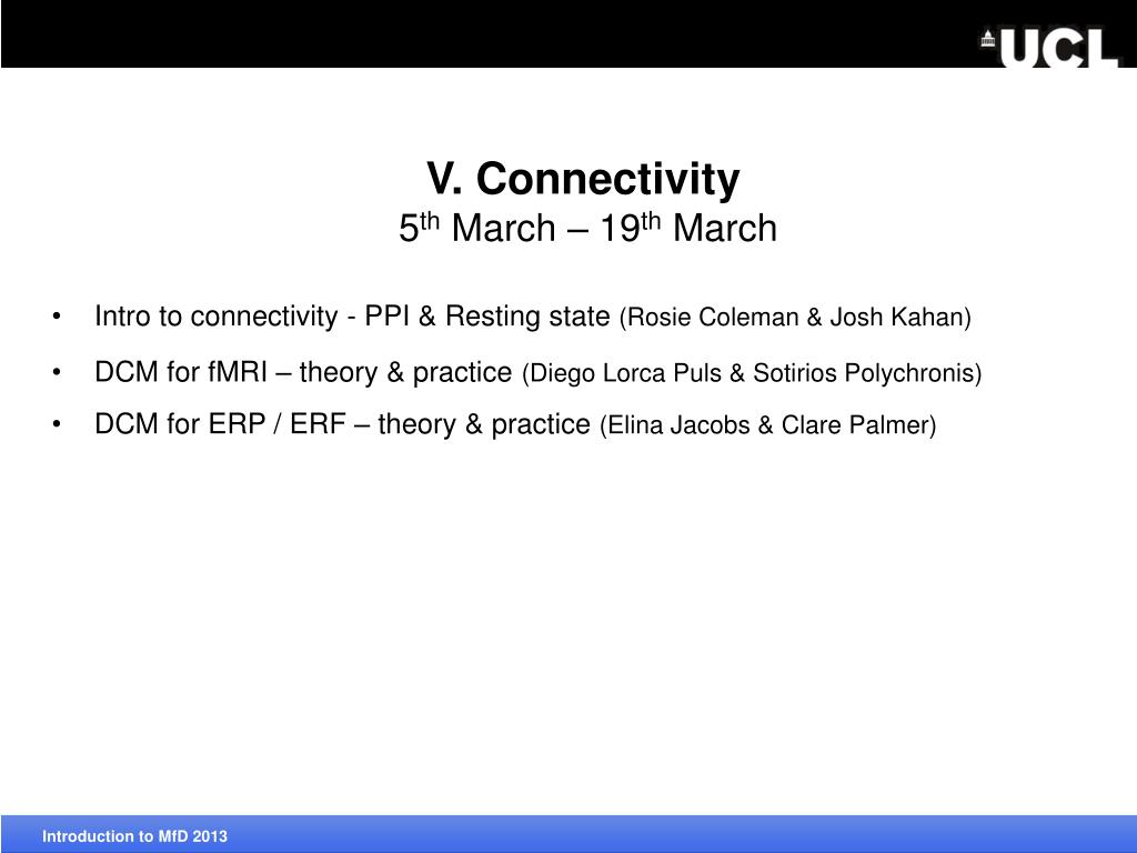 V. Connectivity 5th March – 19thMarch • Intro to connectivity - PPI & Resting state (Rosie Coleman & Josh Kahan) Introduction to MfD2013