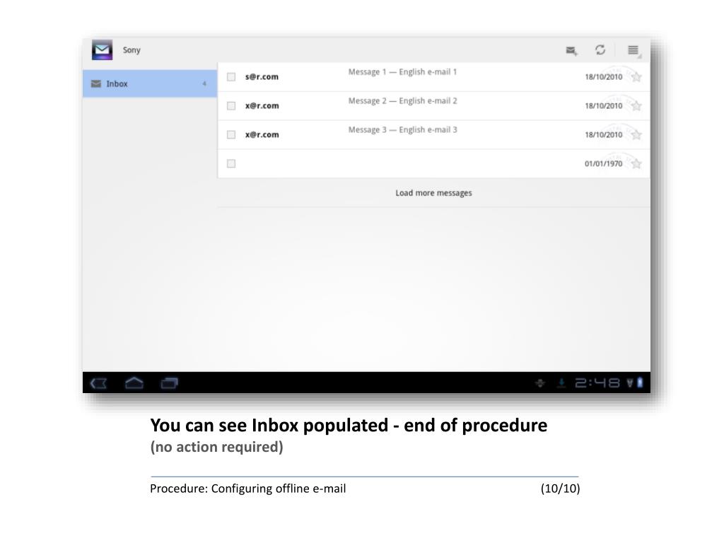 You can see Inbox populated - end of procedure(no action required) Procedure: Configuring offline e-mail (10/10)