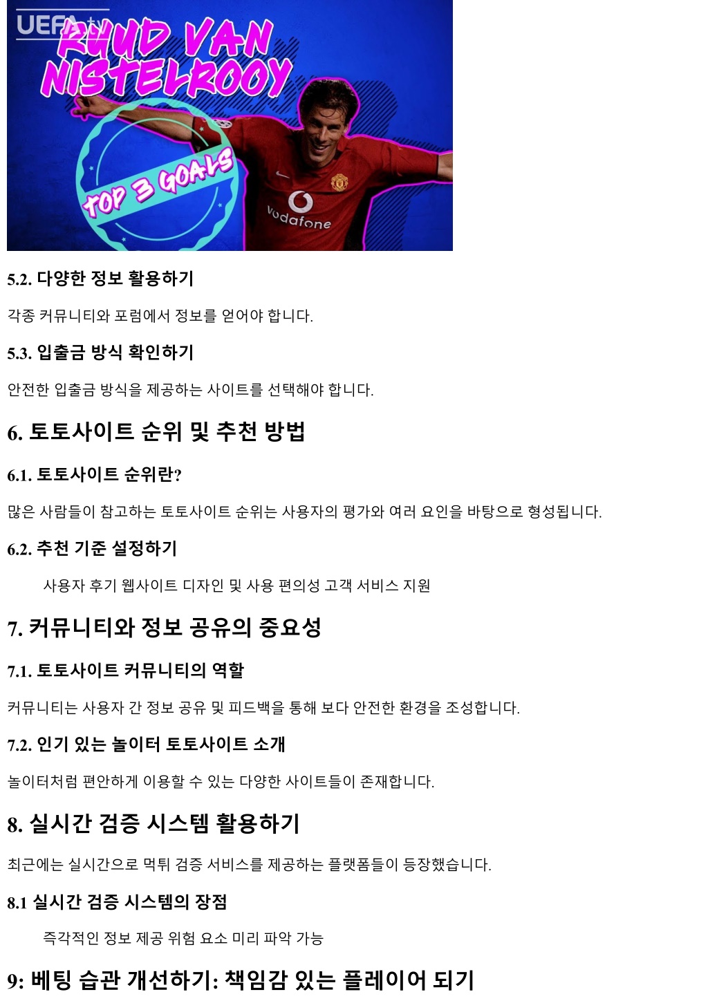 5.2. 다양한정보활용하기 각종커뮤니티와포럼에서정보를얻어야합니다. 5.3. 입출금방식확인하기 안전한입출금방식을제공하는사이트를선택해야합니다. 6. 토토사이트순위및추천방법 6.1. 토토사이트순위란? 많은사람들이참고하는토토사이트순위는사용자의평가와여러요인을바탕으로형성됩니다. 6.2. 추천기준설정하기 사용자후기웹사이트디자인및사용편의성고객서비스지원 7. 커뮤니티와정보공유의중요성 7.1. 토토사이트커뮤니티의역할 커뮤니티는사용자간정보공유및피드백을통해보다안전한환경을조성합니다. 7.2. 인기있는놀이터토토사이트소개 놀이터처럼편안하게이용할수있는다양한사이트들이존재합니다. 8. 실시간검증시스템활용하기 최근에는실시간으로먹튀검증서비스를제공하는플랫폼들이등장했습니다. 8.1 실시간검증시스템의장점 즉각적인정보제공위험요소미리파악가능 9: 베팅습관개선하기: 책임감있는플레이어되기