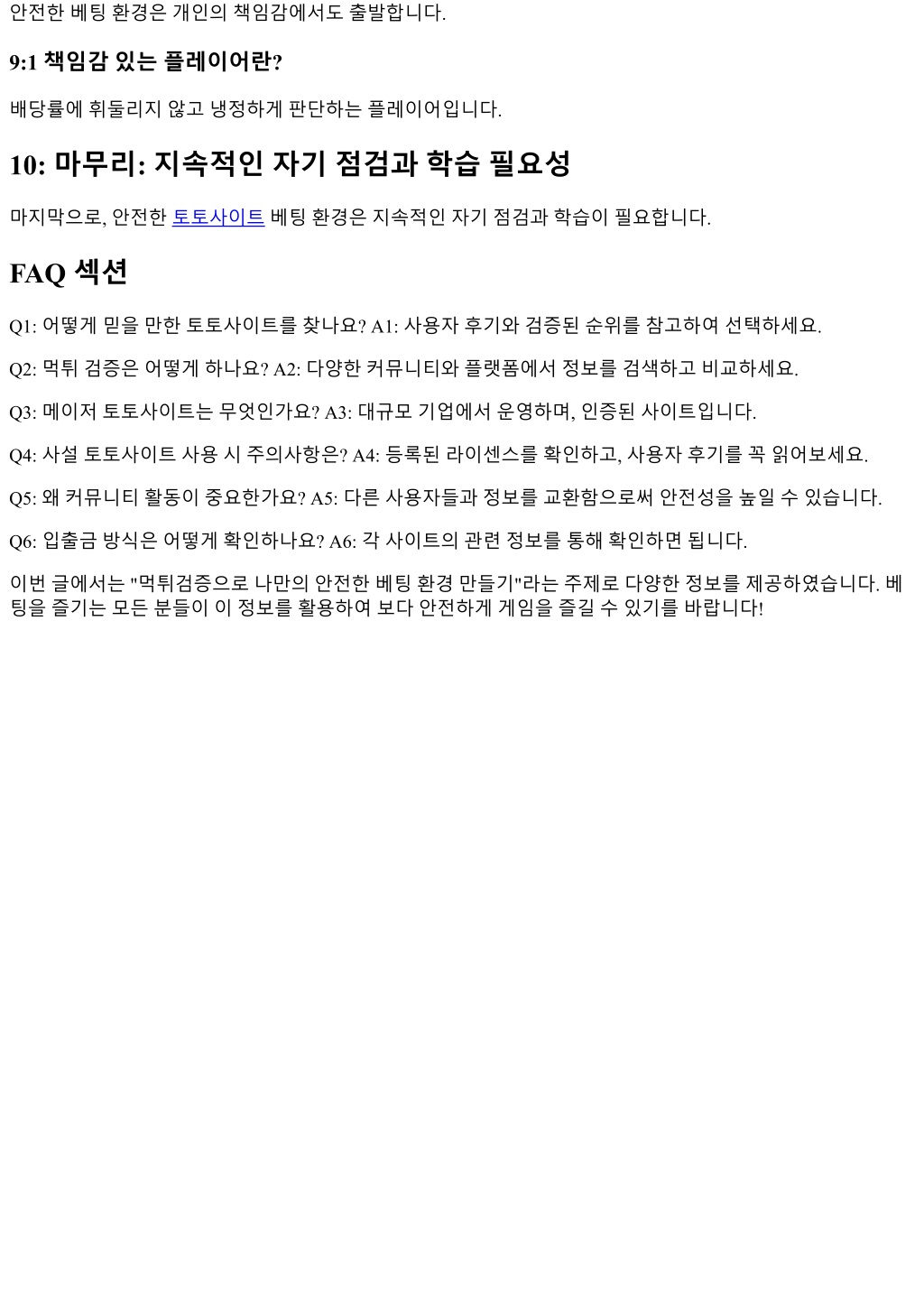 안전한베팅환경은개인의책임감에서도출발합니다.안전한베팅환경은개인의책임감에서도출발합니다. 9:1 책임감있는플레이어란? 배당률에휘둘리지않고냉정하게판단하는플레이어입니다. 10: 마무리: 지속적인자기점검과학습필요성 마지막으로, 안전한토토사이트베팅환경은지속적인자기점검과학습이필요합니다. FAQ 섹션 Q1: 어떻게믿을만한토토사이트를찾나요? A1: 사용자후기와검증된순위를참고하여선택하세요. Q2: 먹튀검증은어떻게하나요? A2: 다양한커뮤니티와플랫폼에서정보를검색하고비교하세요. Q3: 메이저토토사이트는무엇인가요? A3: 대규모기업에서운영하며, 인증된사이트입니다. Q4: 사설토토사이트사용시주의사항은? A4: 등록된라이센스를확인하고, 사용자후기를꼭읽어보세요. Q5: 왜커뮤니티활동이중요한가요? A5: 다른사용자들과정보를교환함으로써안전성을높일수있습니다. Q6: 입출금방식은어떻게확인하나요? A6: 각사이트의관련정보를통해확인하면됩니다. 이번글에서는 "먹튀검증으로나만의안전한베팅환경만들기"라는주제로다양한정보를제공하였습니다. 베 팅을즐기는모든분들이이정보를활용하여보다안전하게게임을즐길수있기를바랍니다!
