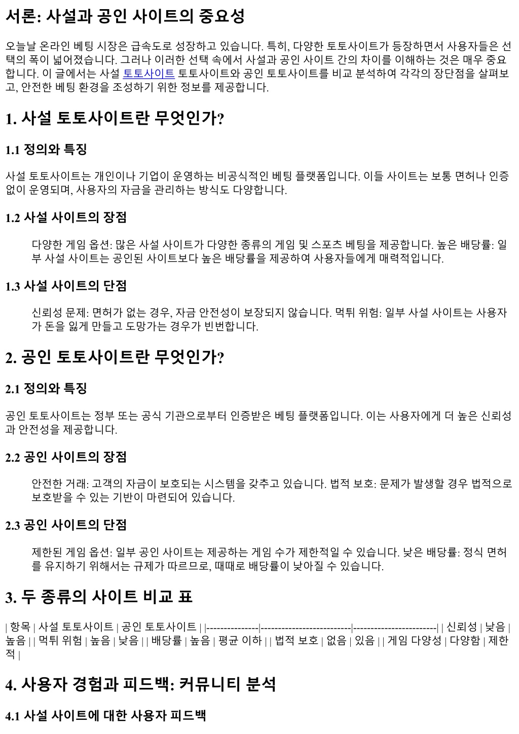 서론: 사설과공인사이트의중요성 오늘날온라인베팅시장은급속도로성장하고있습니다. 특히, 다양한토토사이트가등장하면서사용자들은선 택의폭이넓어졌습니다. 그러나이러한선택속에서사설과공인사이트간의차이를이해하는것은매우중요 합니다. 이글에서는사설토토사이트토토사이트와공인토토사이트를비교분석하여각각의장단점을살펴보 고, 안전한베팅환경을조성하기위한정보를제공합니다. 1. 사설토토사이트란무엇인가? 1.1 정의와특징 사설토토사이트는개인이나기업이운영하는비공식적인베팅플랫폼입니다. 이들사이트는보통면허나인증 없이운영되며, 사용자의자금을관리하는방식도다양합니다. 1.2 사설사이트의장점 다양한게임옵션: 많은사설사이트가다양한종류의게임및스포츠베팅을제공합니다. 높은배당률: 일 부사설사이트는공인된사이트보다높은배당률을제공하여사용자들에게매력적입니다. 1.3 사설사이트의단점 신뢰성문제: 면허가없는경우, 자금안전성이보장되지않습니다. 먹튀위험: 일부사설사이트는사용자 가돈을잃게만들고도망가는경우가빈번합니다. 2. 공인토토사이트란무엇인가? 2.1 정의와특징 공인토토사이트는정부또는공식기관으로부터인증받은베팅플랫폼입니다. 이는사용자에게더높은신뢰성 과안전성을제공합니다. 2.2 공인사이트의장점 안전한거래: 고객의자금이보호되는시스템을갖추고있습니다. 법적보호: 문제가발생할경우법적으로 보호받을수있는기반이마련되어있습니다. 2.3 공인사이트의단점 제한된게임옵션: 일부공인사이트는제공하는게임수가제한적일수있습니다. 낮은배당률: 정식면허 를유지하기위해서는규제가따르므로, 때때로배당률이낮아질수있습니다. 3. 두종류의사이트비교표 | 항목 | 사설토토사이트 | 공인토토사이트 | |---------------|--------------------------|------------------------| | 신뢰성 | 낮음 | 높음 | | 먹튀위험 | 높음 | 낮음 | | 배당률 | 높음 | 평균이하 | | 법적보호 | 없음 | 있음 | | 게임다양성 | 다양함 | 제한 적 | 4. 사용자경험과피드백: 커뮤니티분석 4.1 사설사이트에대한사용자피드백