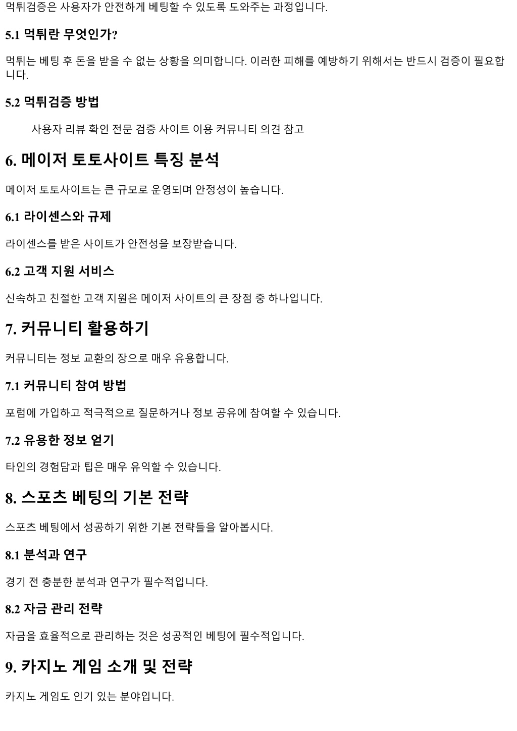 먹튀검증은사용자가안전하게베팅할수있도록도와주는과정입니다.먹튀검증은사용자가안전하게베팅할수있도록도와주는과정입니다. 5.1 먹튀란무엇인가? 먹튀는베팅후돈을받을수없는상황을의미합니다. 이러한피해를예방하기위해서는반드시검증이필요합 니다. 5.2 먹튀검증방법 사용자리뷰확인전문검증사이트이용커뮤니티의견참고 6. 메이저토토사이트특징분석 메이저토토사이트는큰규모로운영되며안정성이높습니다. 6.1 라이센스와규제 라이센스를받은사이트가안전성을보장받습니다. 6.2 고객지원서비스 신속하고친절한고객지원은메이저사이트의큰장점중하나입니다. 7. 커뮤니티활용하기 커뮤니티는정보교환의장으로매우유용합니다. 7.1 커뮤니티참여방법 포럼에가입하고적극적으로질문하거나정보공유에참여할수있습니다. 7.2 유용한정보얻기 타인의경험담과팁은매우유익할수있습니다. 8. 스포츠베팅의기본전략 스포츠베팅에서성공하기위한기본전략들을알아봅시다. 8.1 분석과연구 경기전충분한분석과연구가필수적입니다. 8.2 자금관리전략 자금을효율적으로관리하는것은성공적인베팅에필수적입니다. 9. 카지노게임소개및전략 카지노게임도인기있는분야입니다.