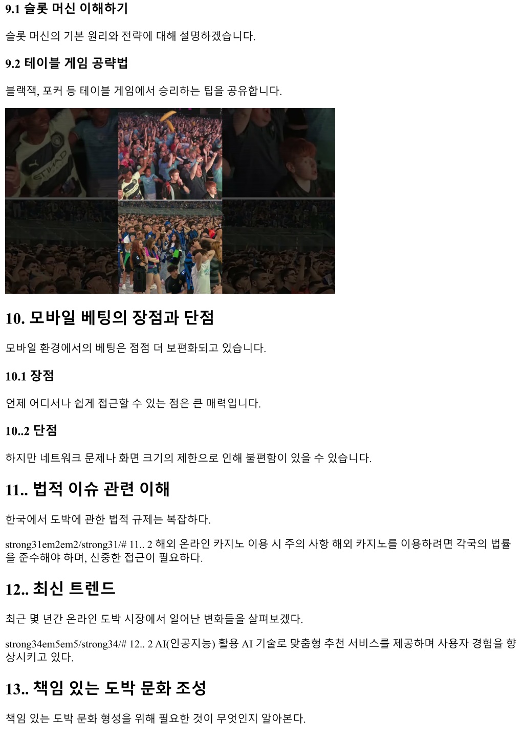 9.1 슬롯머신이해하기 슬롯머신의기본원리와전략에대해설명하겠습니다. 9.2 테이블게임공략법 블랙잭, 포커등테이블게임에서승리하는팁을공유합니다. 10. 모바일베팅의장점과단점 모바일환경에서의베팅은점점더보편화되고있습니다. 10.1 장점 언제어디서나쉽게접근할수있는점은큰매력입니다. 10..2 단점 하지만네트워크문제나화면크기의제한으로인해불편함이있을수있습니다. 11.. 법적이슈관련이해 한국에서도박에관한법적규제는복잡하다. strong31em2em2/strong31/# 11.. 2 해외온라인카지노이용시주의사항해외카지노를이용하려면각국의법률 을준수해야하며, 신중한접근이필요하다. 12.. 최신트렌드 최근몇년간온라인도박시장에서일어난변화들을살펴보겠다. strong34em5em5/strong34/# 12.. 2 AI(인공지능) 활용 AI 기술로맞춤형추천서비스를제공하며사용자경험을향 상시키고있다. 13.. 책임있는도박문화조성 책임있는도박문화형성을위해필요한것이무엇인지알아본다.