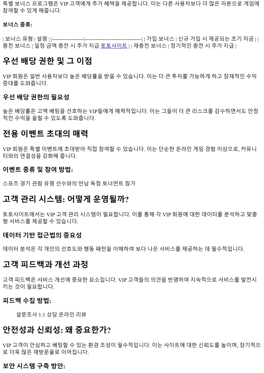 특별보너스프로그램은 VIP 고객에게추가혜택을제공합니다. 이는다른사용자보다더많은자본으로게임에 참여할수있게해줍니다. 보너스종류: | 보너스유형 | 설명 | |------------------|--------------------------------| | 가입보너스 | 신규가입시제공되는초기자금 | | 충전보너스 | 일정금액충전시추가지급토토사이트 | | 재충전보너스 | 정기적인충전시추가지급 | 우선배당권한및그이점 VIP 회원은일반사용자보다높은배당률을받을수있습니다. 이는더큰투자를가능하게하고잠재적인수익 증대를도와줍니다. 우선배당권한의필요성 높은배당률은고액베팅을선호하는 VIP들에게매력적입니다. 이는그들이더큰리스크를감수하면서도안정 적인수익을올릴수있도록도와줍니다. 전용이벤트초대의매력 VIP 회원은특별이벤트에초대받아직접참여할수있습니다. 이는단순한온라인게임경험이상으로, 커뮤니 티와의연결성을강화해줍니다. 이벤트종류및참여방법: 스포츠경기관람유명선수와의만남독점토너먼트참가 고객관리시스템: 어떻게운영될까? 토토사이트에서는 VIP 고객관리시스템이필요합니다. 이를통해각 VIP 회원에대한데이터를분석하고맞춤 형서비스를제공할수있습니다. 데이터기반접근법의중요성 데이터분석은각개인의선호도와행동패턴을이해하여보다나은서비스를제공하는데필수적입니다. 고객피드백과개선과정 고객피드백은서비스개선에중요한요소입니다. VIP 고객들의의견을반영하여지속적으로서비스를발전시 키는것이필요합니다. 피드백수집방법: 설문조사 1:1 상담온라인리뷰 안전성과신뢰성: 왜중요한가? VIP 고객이안심하고베팅할수있는환경조성이필수적입니다. 이는사이트에대한신뢰도를높이며, 장기적으 로더욱많은재방문율로이어집니다. 보안시스템구축방안: