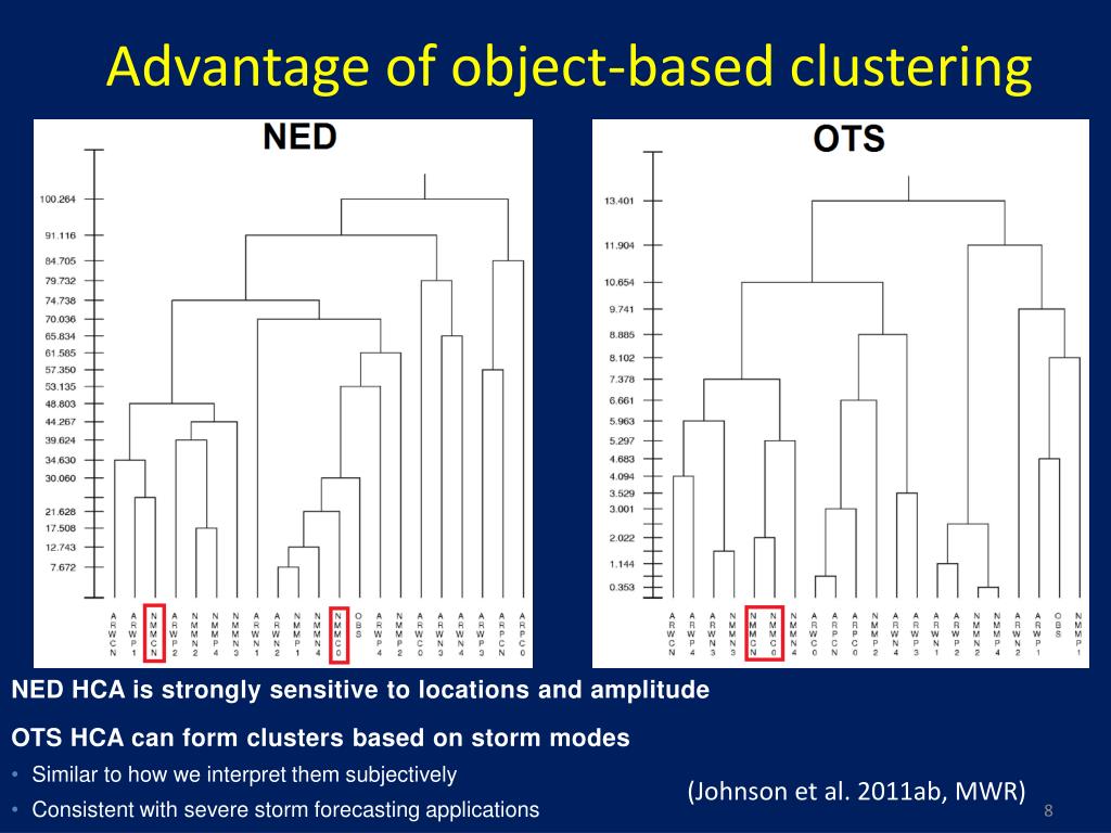 Advantage of object-based clustering NED HCA is strongly sensitive to locations and amplitude OTS HCA can form clusters based on storm modes • Similar to how we interpret them subjectively • Consistent with severe storm forecasting applications (Johnson et al. 2011ab, MWR)